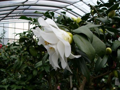 樋状に中折れした細長い14~15枚の花びらが 三、四重に重なり 外弁は弓上に大きく反り 内弁は立ち上がり 弁間がすいてマグノリアに似た秀麗な花形。