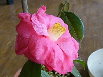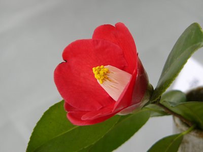 花も葉も表面平滑でシワがなく 釣り合いのとれた茶花向きの端正な花。