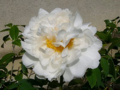 品種名は不明だが 大きくて華やかなボタン。 開きかけた頃に雨が降ったので 長い支柱を立ててビニール傘を差しかけていた。