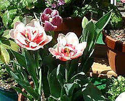花壇や鉢に いろんな色の花が咲き始めました。 左側の花壇には バラ、ボタン、スイセン、アネモネなど いろいろ植えています。 少々 過密気味かしらと思っています。